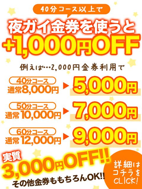 | 50 min | ¥10,000 ⇒¥8,000 | ¥10,000 ⇒¥7,000 | ¥10,000 ⇒¥6,000 |